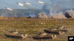 وزارت دفاع روسیه گفته است که در مشق و تمرین نظامیان آن کشور افزون بر پرتاب اسلحۀ سنگین از جتهای جنگی و بم افگن، سیستم های دافع هوا و ضد طیاره و کشتیهای جنگی در بحیرۀ سیاه و کسپین نیز کار گرفته شده است.
