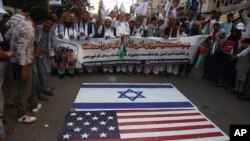 احزاب سیاسی و مذهبی، دهها مظاهرات کوچک را در شهرهای کراچی، لاهور، پشاور و اسلامآباد، پایتخت پاکستان، راه اندازی کرده و بیرقهای ایالات متحده و اسراییل را آتش زدند.