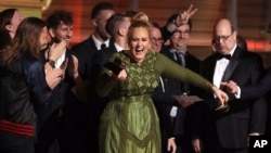در پنجاه و نهمین جشنوارۀ اهدای جوایز گرَمی، که دیشب در شهر لاس انجلس برگزار شد، ادیل، آوازخوان بریتانیایی توانست جمعاً پنج جایزه را برنده شود.