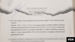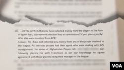 صدای امریکا به اسنادی نیز دست یافته است که بر اساس سفارش شورای بین المللی کرکت از برخی از کارمندان مظنون بورد کرکت افغانستان تحقیقات صورت گرفته است. از یکی از مقامهای پیشین بورد کرکت که یکی از مسوولین لیگ برتر نیز بود، ۱۳ و از یک مقام دیگر ۱۱ سوال پرسیده شده است. این پرسش ها و پاسخ ها به گونه کتبی صورت گرفته است. تمامی پرسش ها در مورد ادعاهای موجودیت فساد، گرفتن پول از مالکین تیمها، سازش در بازیها و تاخیر در تسلیم دهی اعتبار نامهها بوده است.