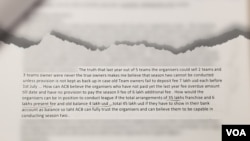 صدای امریکا به اسنادی دست یافته است که موجودیت فساد در لیگ برتر کرکت افغانستان را نشان میدهد. در این گزارش، ادعاهای فساد از سوی شورای بین المللی کرکت، بورد کرکت افغانستان و ریاست جمهوری افغانستان بررسی شده است. اعترافات برخی از مقامهای تنظیم کنندۀ لیگ برتر کرکت افغانستان در مورد اخذ پول نقد، اظهارات یکی از مالکین هندی یک تیم این لیگ، مکاتبه و ایمیل های فرستاده شده در مورد ادعاهای فساد و حیف میل صدها هزار دالر نیز از بخش های دیگر این گزارش است.