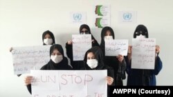 شماری از اعضای شبکۀ مشارکت سیاسی زنان افغانستان علیه آنچه رویکرد دوگانۀ سازمان ملل متحد در قبال طالبان میخوانند، در مکانی سربسته اعتراض کردند و شعار سر دادند.