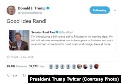 دونالد ترمپ، رئیس جمهور ایالات متحده از طرح لایحۀ توقف کمک های امریکا به پاکستان حمایت کرد. دونالد ترمپ، رئیس جمهور ایالات متحده، از این سخن سناتور جمهوریخواه، رند پال استقبال کرده و در یک پیام تویتر نگاشته است که پایان بخشیدن کمک ها به پاکستان "یک مفکورۀ خوب" است.