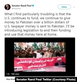رند پال، سناتور جمهوریخواه در یک پیام تویتر گفته است که در روز های آینده خامۀ یک لایحه را به کانگرس ارایه میکند که در آن، قطع کمک های امریکا به پاکستان پیشنهاد گردیده و نیز گفته شده که این پول ها، در عوض، بر ساخت و ساز زیربنا ها در داخل امریکا مصرف شود.